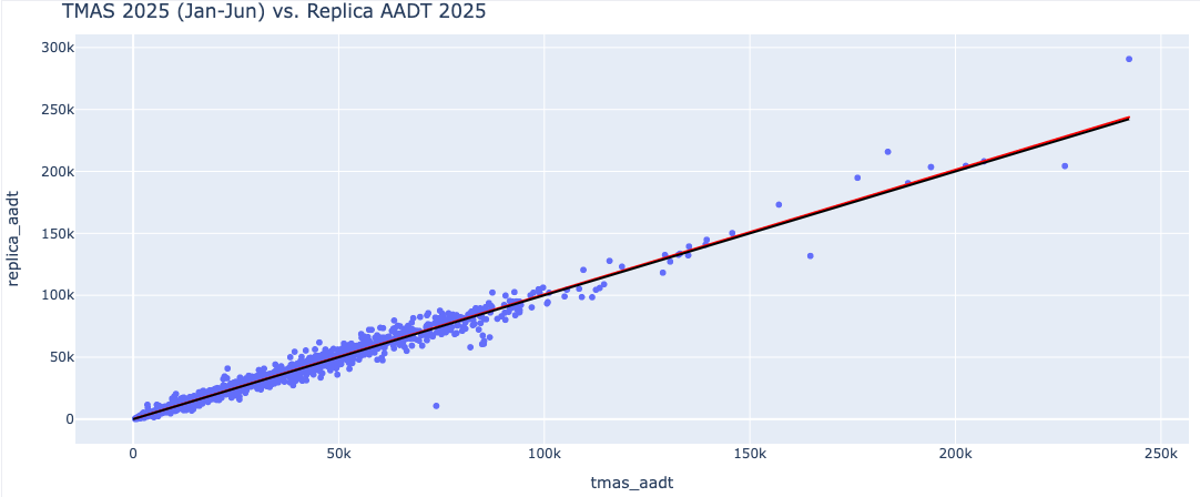 The table below summarizes the distribution of Replica’s AADT estimates within specific percentage error margins relative to permanent counter volumes. Additionally, the scatter plot illustrates the correlation (R-squared= 0.98) between FHWA TMAS AADT (January–June 2025) and Replica AADT (2025), demonstrating the model's overall fit and reliability.